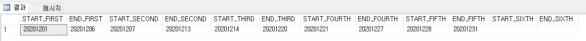 해당 월 1주 차, 2주 차, 3주 차, 4주 차, 5주 차, 6주 차별 시작일자 종료일자를 구하는 쿼리는 아래와 같다.